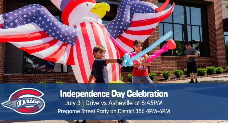 Join the Greenville Drive for its annual Independence Day Celebration on July 3rd, 2025! The Drive will take on Asheville at 6:45, and there will be a fantastic pregame party on the District from 4 pm to 6 pm. There will also be a Special Forces Jump Team performance, a flyover at the National Anthem, special recognitions and moments, and more throughout the night, concluding with a spectacular fireworks show!