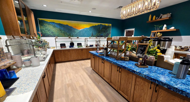 You can play shuffleboard or pool in the game room and there is a full bar area downstairs to have an adult beverage. Coffee and tea are served for free in the lobby all day and the hotel offers free breakfast every morning from 6-9 am on weekdays and 7-10 am on weekends. They had a large variety of breakfast foods like yogurt, cereal, bagels, English muffins, eggs, bacon, grits, and fruit. My kids really loved it.