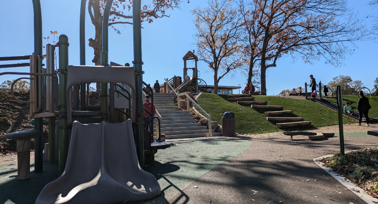 The playground we found was toddler friendly and low, but had some taller, more challenging parts. The entire playground is fenced in, along with a sidewalk that circles it for parents that want to get in some extra steps while watching kids play. There were also park benches and swings along the perimeter.